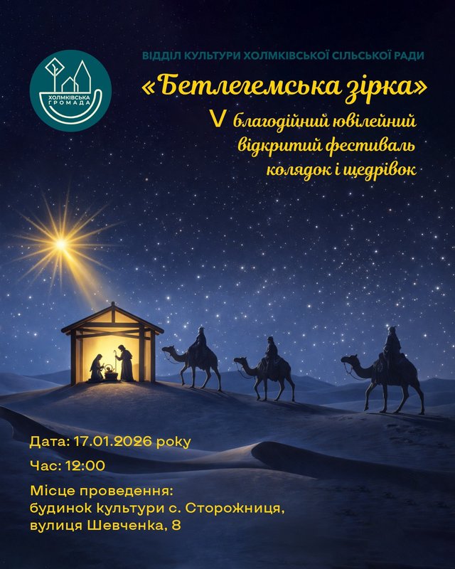 У будинку культури села Сторожниця 17 січня о 12:00 розпочнеться благодійний ювілейний відкритий фестиваль колядок і щедрівок «Бетлегемська зірка». Ця подіяalready відбудеться в п’ятий раз і об’єднає людей навколо давніх традицій, української народної пісні та духовності.