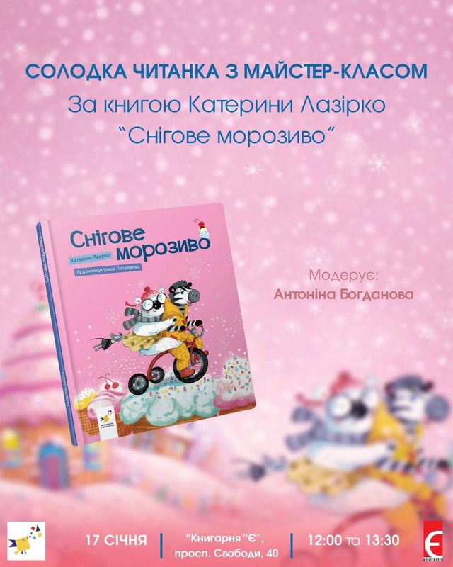 Для дітей запланована літературна зустріч зчитання книжки «Снігове морозиво» Катерини Лазірко. Ця книжка ніжно і цікаво знайомить дітей з темами природи та екології.