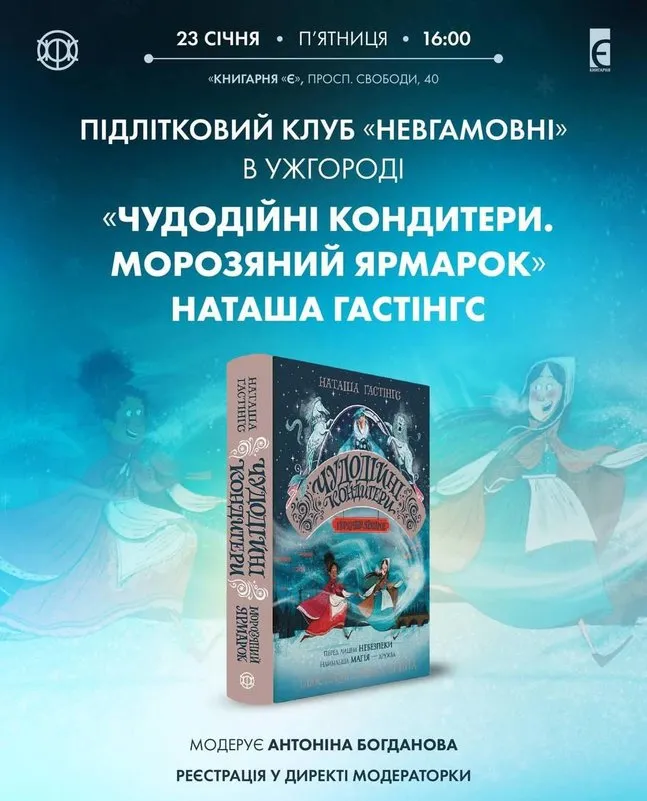 В «Книгарні „Є“», що знаходиться в Ужгороді на проспект Свободи, 40, молоді любителі магії та пригод зустрінуться, щоб обговорити книгу «Чудодійні кондитери. Морозяний ярмарок» від Наташі Гастінгс. Це книга про життєві витратні взаємини та силу надії. Початок о 16:00, реєстрація проводиться через відповідну літературу в особистих повідомленнях до Антоніни Богданової (інстаграм: @arto.nina), чи за допомогою WhatsApp/Viber/Telegram за номером +380961350772.