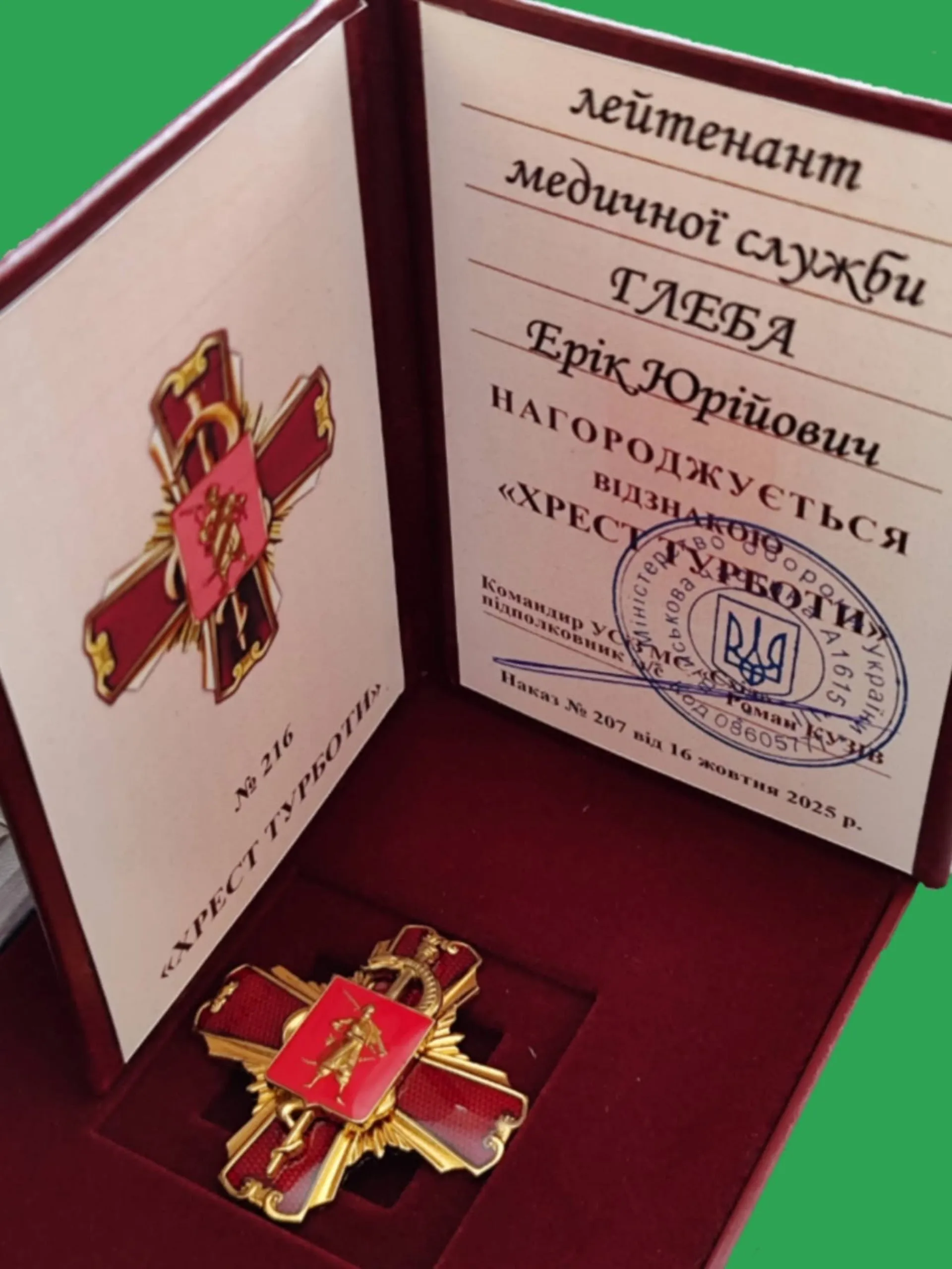Ерік Глеба, військовий медик 128 окремої гірсько-штурмової Закарпатської бригади, отримав нагороду «Хрест Турботи» за свій внесок у порятунок життя українських військових.