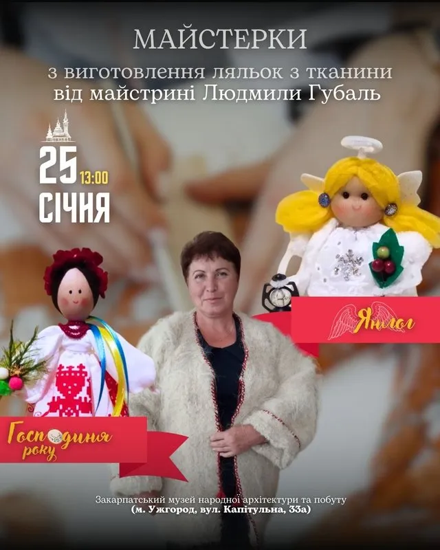 До Ужгородського скансен запрошують охочих повправлятися у виготовленні милих ляльок. На майстерці будуть виготовляти два різновиди — «Господиня року» та «Янгол». Захід проведе заслужена майстриня народної творчості України Людмила Губаль.
