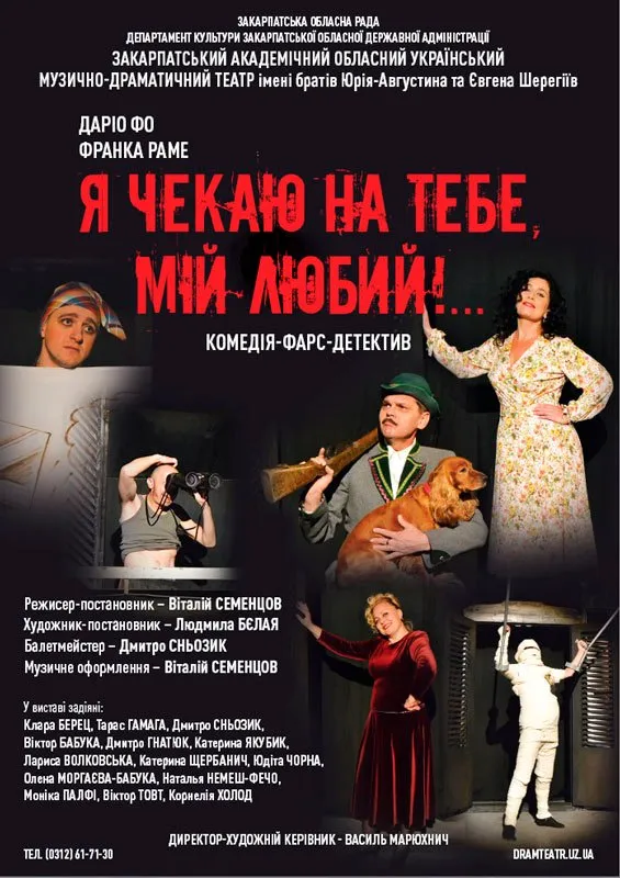 В Ужгороді ця моновистава перетворюється на комедію-фарс-детектив, у якій беруть участь аж 11 акторів. Комедія «Я чекаю на тебе, мій любий!..» дозволяє зазирнути в глибини жіночої психології, підглянути інтимні таємниці, про які не прийнято говорити вголос і ще раз задуматися про вічні цінності. Бешкетний і смішний «жіночий» погляд на життя буде цікавий не тільки жіночій аудиторії, а й чоловікам.
