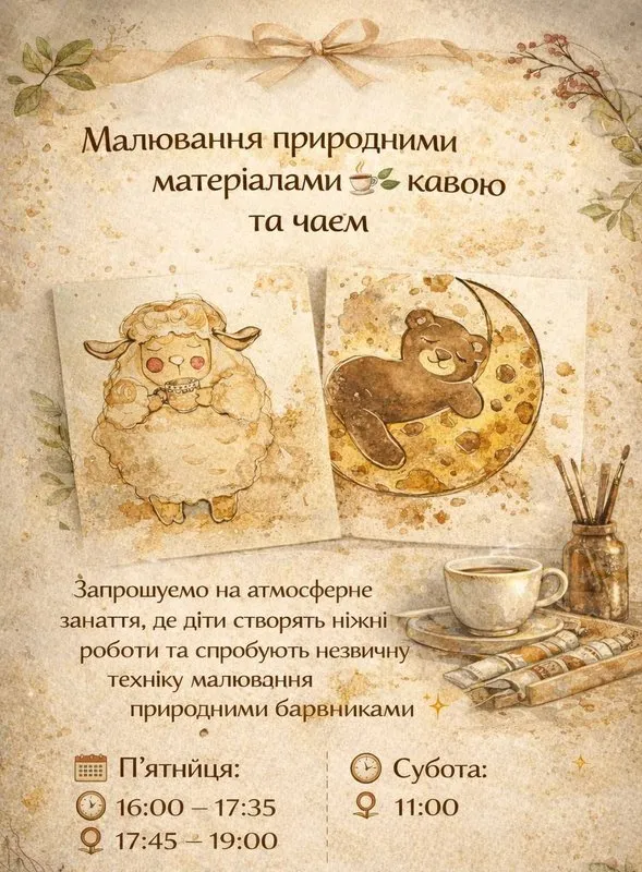 Дітей 9-13 років запрошують на атмосферне заняття, де вони створять ніжні роботи та спробують незвичну техніку малювання природними барвниками. Вартість — 350 грн. Всі матеріали нададуть на занятті. Телефон для запису 0509372115