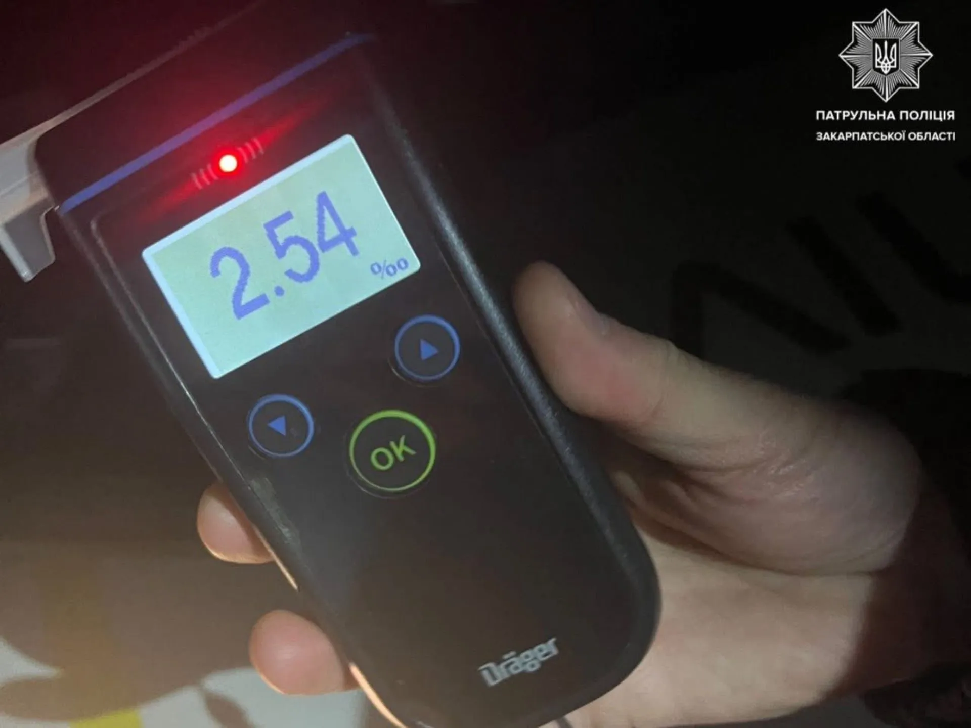 Під час спілкування з поліцейськими, у водія були виявлені ознаки алкогольного сп’яніння. Він погодився пройти огляд на місці зупинки. Результат тесту показав високий рівень алкоголю – 2,54 проміле.