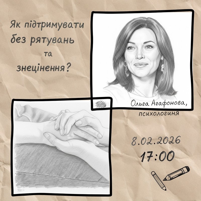Разом із психологинею Ольгою Агафоновою учасники зустрічі поговорять, як правильно підтримувати людину без рятування та знецінення. Як не добивати порадами чи поспіхом? Як бути поруч, щоб людині ставало не гірше, а краще?