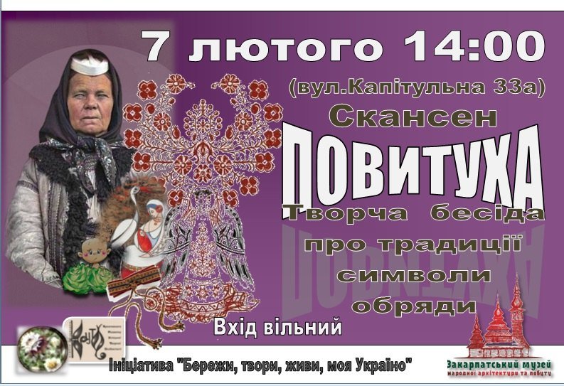Поринути у традиції краю та давні часи, пізнати сакральність образу повитухи дозволить творча бесіда «Повитуха», зорганізована в рамках ініціативи «Бережи, твори, живи, моя Україно» співпраці з Ужгородським скансеном.
