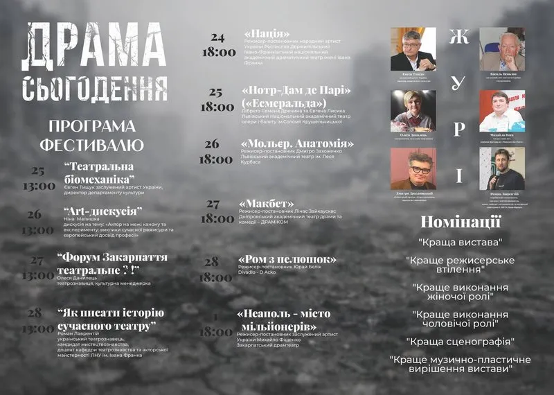 Від 24 лютого до 1 березня в Закарпатському драмтеатрі пройде ІІІ міжнародний театральний фестиваль актуальної драматургії під назвою “Драма сьогодення”. Ця подія об’єднає театральні колективи з різних куточків країни, а також пропонує різноманітні лекції, майстер-класи, виставки та музичні виступи.