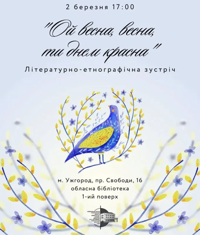 Закарпатська обласна універсальна наукова бібліотека імені Федора Потушняка запрошує на тематичну зустріч. Захід присвячений народним традиціям зустрічі весни. Учасники зможуть дізнатися більше про старовинні українські обряди та звичаї.