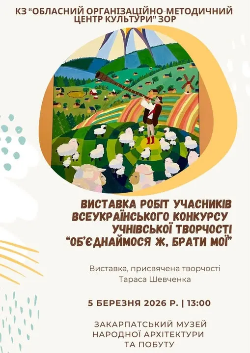 5 березня 2026 року о 13:00 в мальовничому скансені відбудеться урочисте відкриття виставки робіт талановитих учасників ІІІ обласного етапу Всеукраїнського конкурсу учнівської творчості «Об’єднаймося ж, брати мої», який цьогоріч присвячений Шевченківським дням. Цей конкурс є чудовою платформою для юних митців Закарпаття, які прагнуть висловити своє бачення творчості Тараса Григоровича Шевченка.