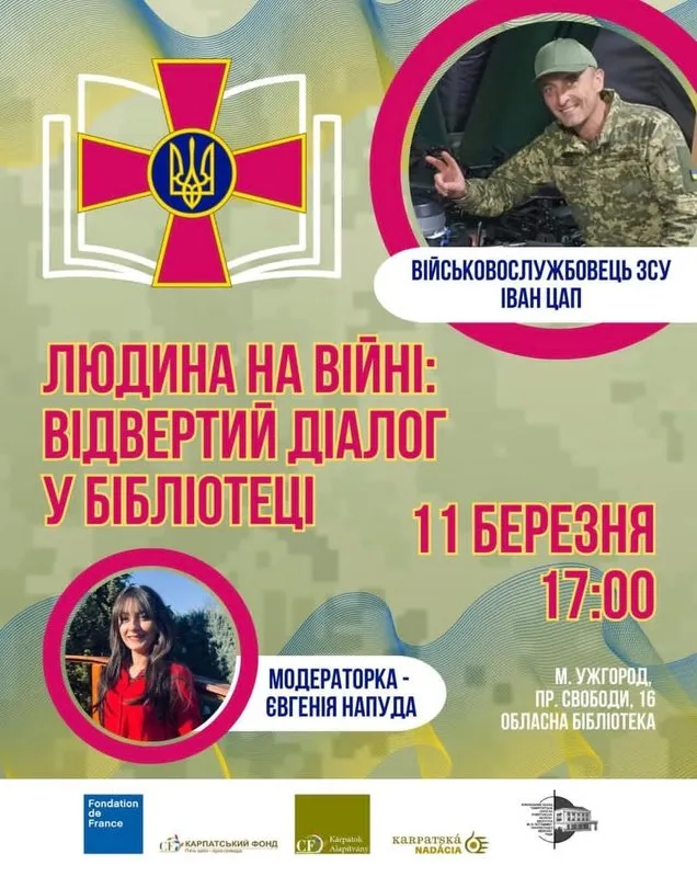 У приміщенні обласної наукової універсальної бібліотеки відбудеться надзвичайно важлива зустріч із військовослужбовцем Збройних Сил України Іваном Цапом. Тема розмови — «Людина на війні: відвертий діалог». Це можливість почути правдиву історію про виклики фронтового життя, переоцінку цінностей та внутрішню силу, яка допомагає зберігати моральні орієнтири у найважчі часи.