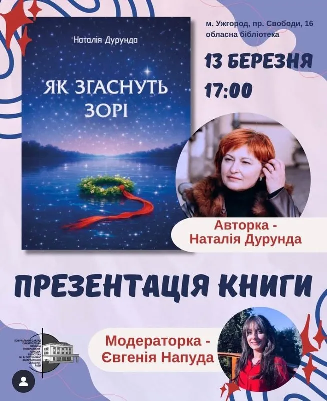 Письменниця Наталія Дурунда представить свою нову книгу «Як згаснуть зорі». Під час заходу авторка розкриє головні ідеї твору та розповість про те, що надихнуло її на створення цієї історії. Гості зможуть взяти участь у дискусії, отримати автограф та зробити спільне фото на згадку.