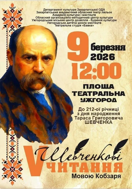 Наступний робочий тиждень в обласному центрі Закарпаття обіцяє бути надзвичайно насиченим та різноплановим. Програма заходів охоплює як урочисті події до державних дат, так і камерні зустрічі, музичні перформанси та театральні прем’єри. Ключовим акцентом перших днів тижня стане вшанування пам’яті великого Кобзаря — Україна відзначає 212-ту річницю від дня народження Тараса Шевченка.