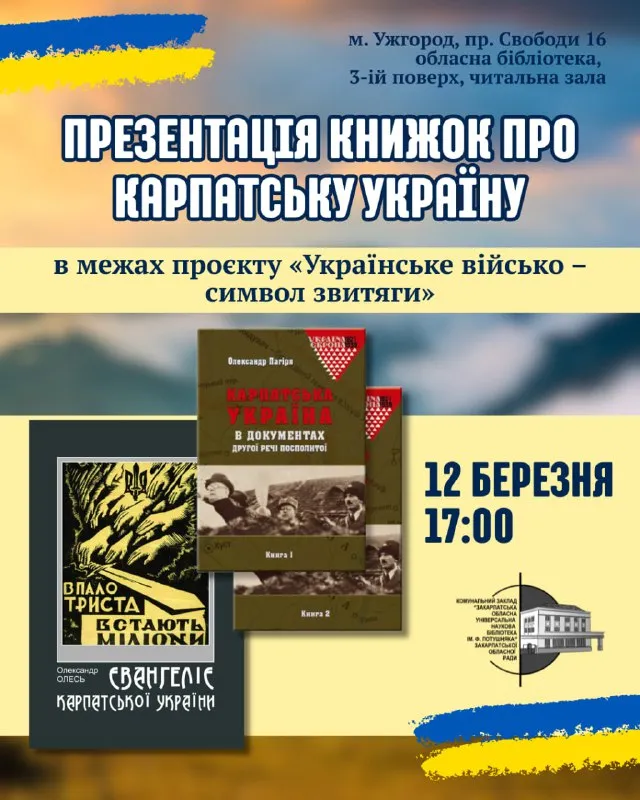 Урочисте представлення книг заплановане на четвер, 12 березня. Зустріч розпочнеться о 17:00 у приміщенні головної читальної зали обласної бібліотеки. Ця ініціатива реалізується в межах патріотичного проєкту під назвою Українське військо — символ звитяги. Організатором виступає група цивільно-військового співробітництва Закарпатського ОТЦК та СП. Захід має на меті популяризацію військової історії та вшанування національних героїв.