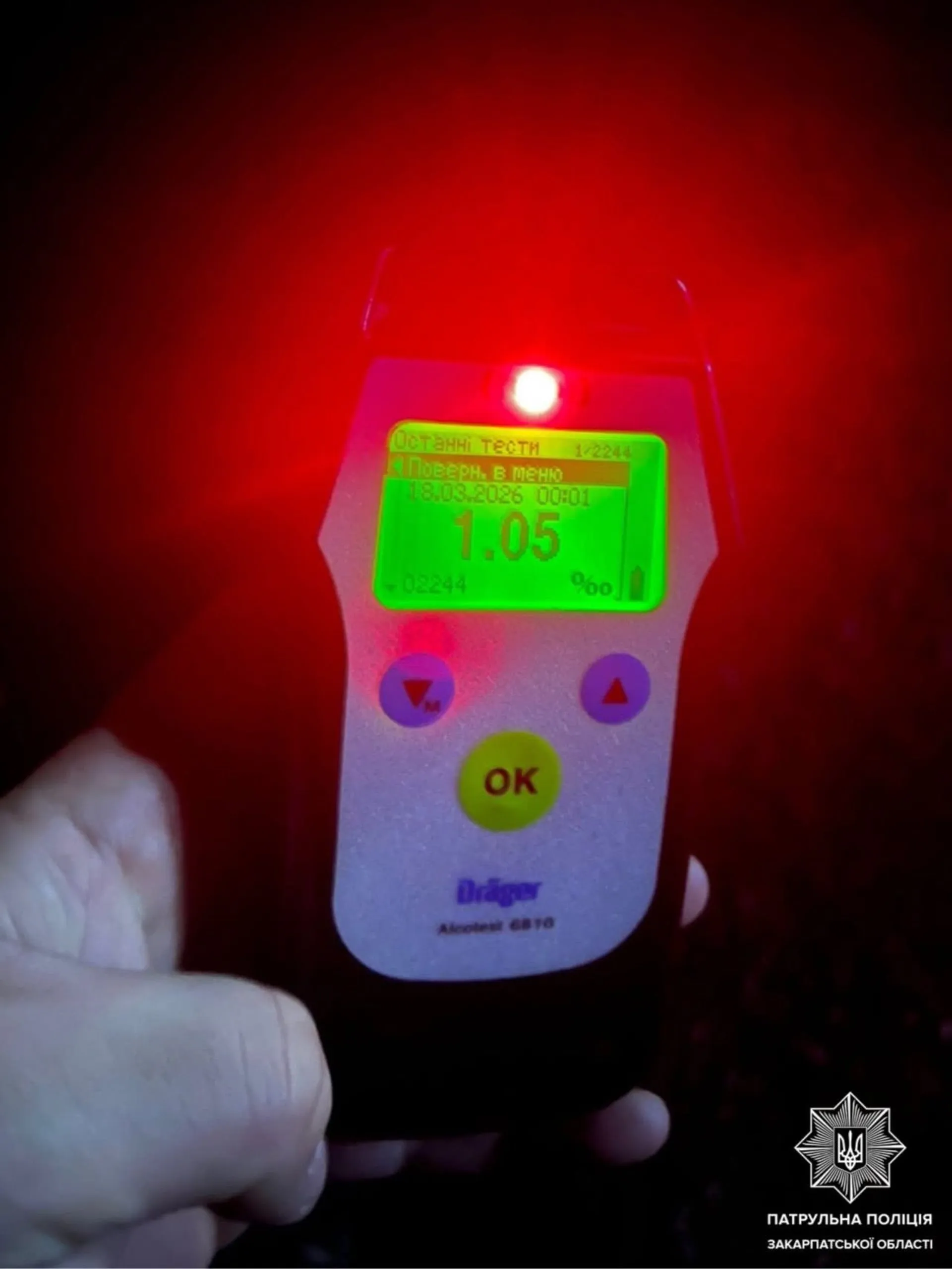 Отримані результати підтвердили підозри правоохоронців щодо стану водійки. Прилад зафіксував показник у 1,05 проміле алкоголю в організмі жінки.