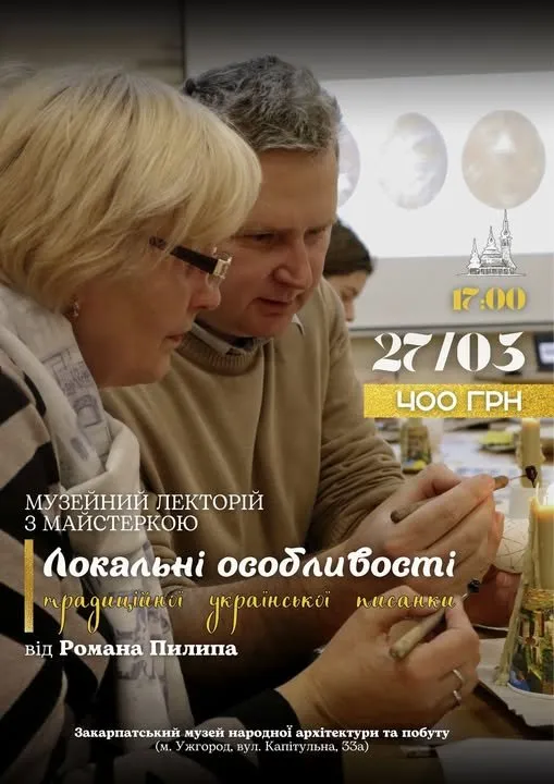 Ужгородський скансен відкриває цикл освітніх заходів, присвячених традиційному українському розпису великодніх яєць. Науковець та майстер Роман Пилип проведе тематичну лекцію «Локальні особливості традиційної української писанки». Дослідник детально розповість про унікальні орнаменти та техніки, що притаманні різним регіонам нашої держави. Після теоретичної частини учасники зможуть власноруч створити писанку під час практичного заняття. Початок заходу о 17:00. Вартість участі, що включає всі необхідні матеріали, становить 400 гривень. Через обмежену кількість місць реєстрація за телефоном +380 (95) 424 06 72 є обов’язковою.
