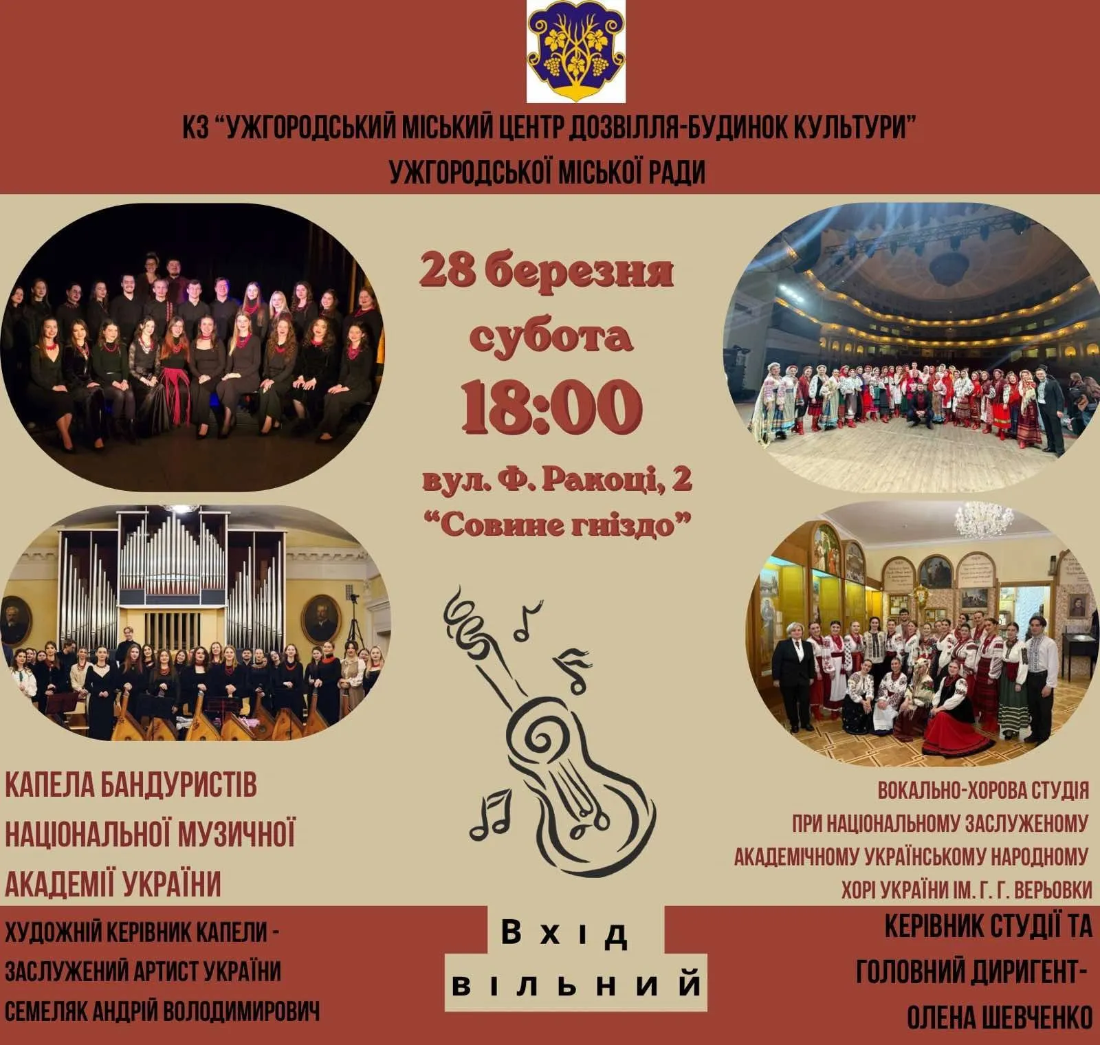 Концерт прийматиме Культурно-історичний центр «Совине гніздо», що розташований за адресою: місто Ужгород, вулиця Ференца Ракоці, будинок 2. Старовинні склепіння центру створять неповторну акустику для виступів.