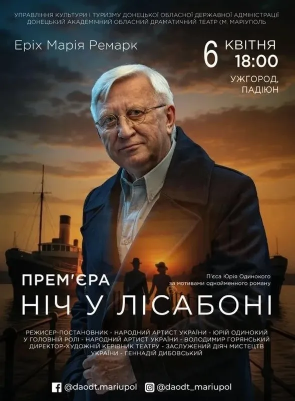 Ця подія — справжній ексклюзив! Донецький академічний обласний драматичний театр, який базується у Маріуполі, представить свою культову виставу «Ніч у Лісабоні». Це постановка за мотивами безсмертного роману Еріха Марії Ремарка. Режисерська робота належить геніальному Юрію Одинокому. Головну роль виконує неперевершений Володимир Горянський. Його гра зачарує кожного глядача.