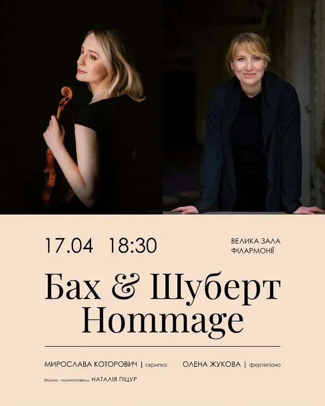 Обласна філармонія запрошує на вечір камерної музики. У виконанні скрипальки Мирослави Которович та піаністки Олени Жукової прозвучать шедеври Й.С. Баха, Ф. Шуберта та сучасної української композиторки Вікторії Польової.