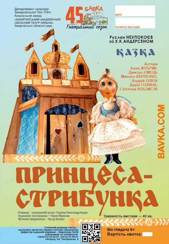 Недільний ранок присвятять дітям: о 11:00 та 13:00 у театрі ляльок «Бавка» покажуть фольклорну казку «Принцеса-стрибунка» про порятунок принцеси Ярмилки.