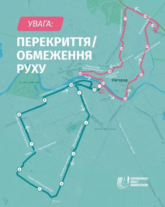 До уваги усіх водіїв, які планують пересування містом 19 квітня! У зв’язку з проведенням Uzhhorod Half Marathon 2026, у місті будуть діяти обмеження та перекриття руху транспорту з 09:00 до 11:30.
