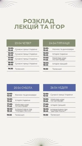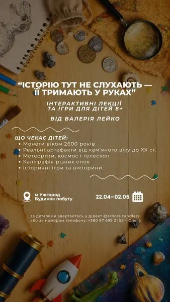 Історик та колекціонер Валерій Лейко запрошує дітей від 8 років на інтерактивні лекції та ігри на теми історії України, космосу та динозаврів, сучасних грошей України тощо.