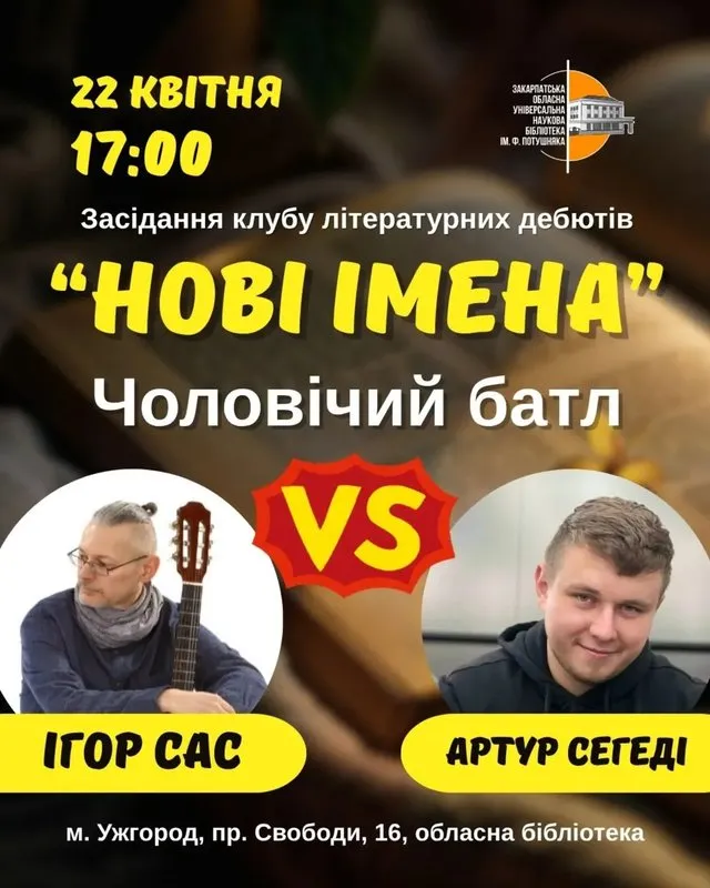 У читальній залі обласної бібліотеки відбудеться відкриття 19-го сезону клубу літературних дебютів «Нові імена». У чоловічому батлі візьмуть участь Ігор Сас та Артур Сегеді.