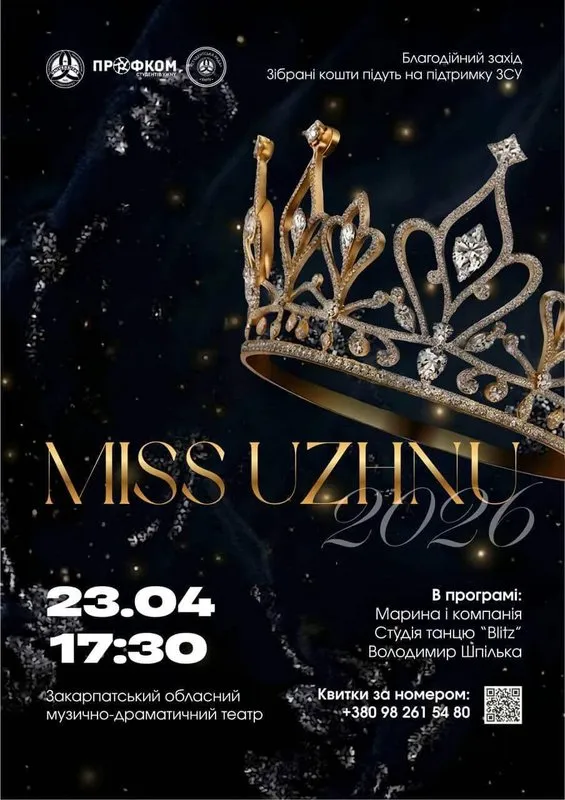 В Закарпатському драмтеатрі відбудеться конкурс «Міс УжНУ 2026». Конкурси будуть супроводжуватися виступом гурту «Марина і компанія» та ін.