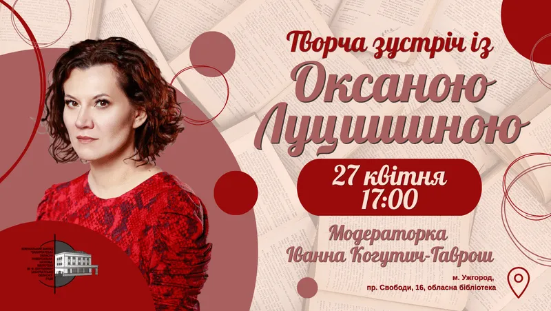 У Закарпатській обласній універсальній науковій бібліотеці ім. Ф. Потушняка відбудеться творча зустріч із письменницею, перекладачкою, літературознавицею та лауреаткою Шевченківської премії Оксаною Луцишиною. Модераторкою події виступить головна редакторка бібліотеки Іванна Когутич-Гаврош. Захід розпочнеться о 17:00, вхід вільний для всіх охочих.
