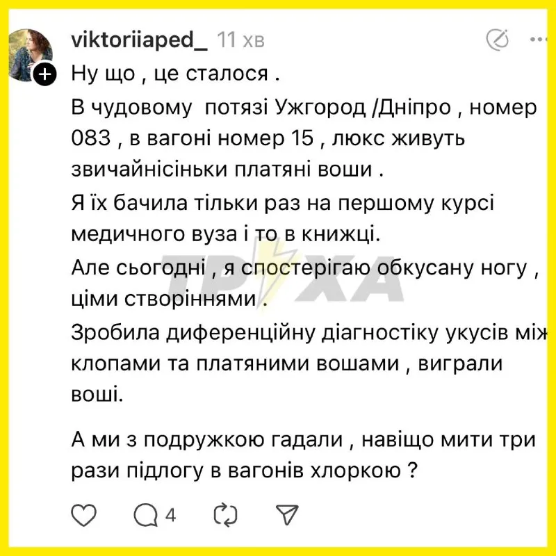 У мережі з’явилася інформація про незадовільний санітарний стан одного з вагонів Укрзалізниці. Пасажирка, яка подорожувала потягом, що курсує між Ужгородом та Дніпром, заявила про наявність паразитів.