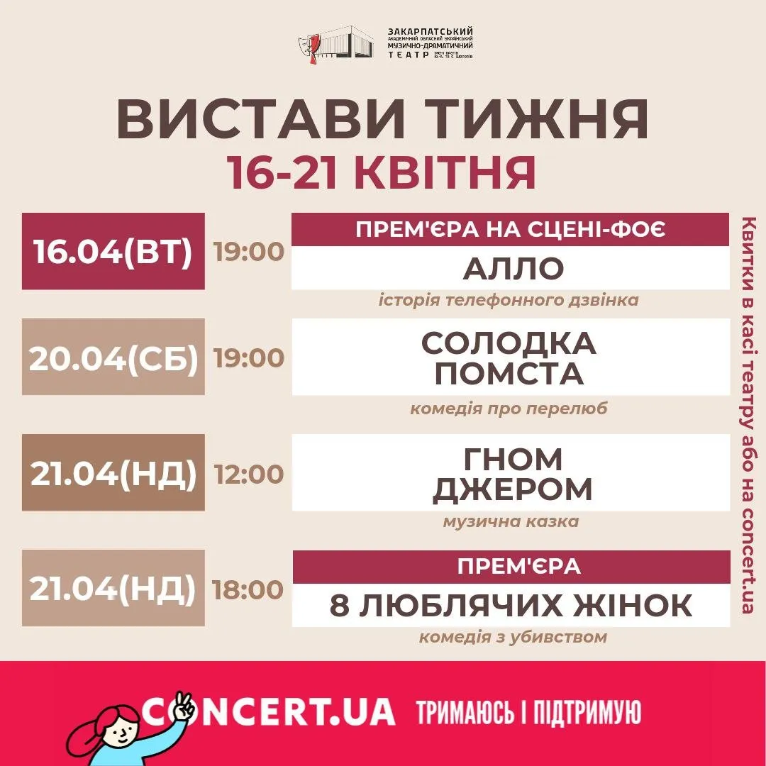Закарпатський академічний обласний український музично-драматичний театр: афіша на 16-21 квітня