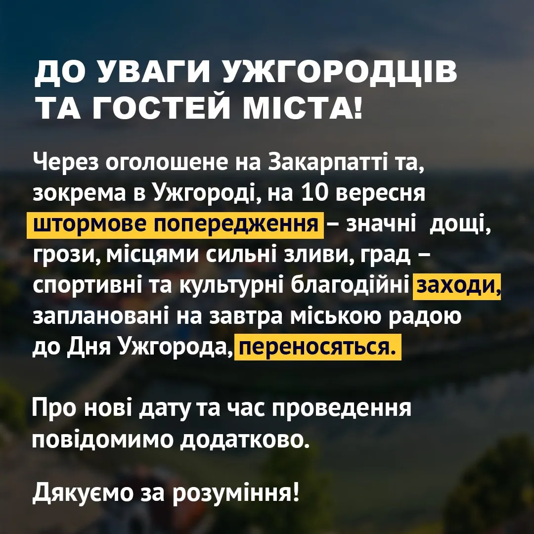 Усі заходи до Дня Ужгорода, заплановані мерією на 10 вересня, перенесено через негоду