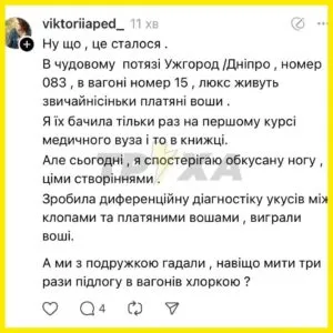 Скандал в Укрзалізниці: пасажирка потяга Ужгород–Дніпро поскаржилася на вошей у вагоні